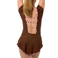 Darling “ladder-back” dress in warm tones is accented with our aubergine dot print. Square neckline with cap sleeves dips to low back with contrast dot print. Adorable on the ice! Italian matte tricot base with flat front skirt and contrast stretch illusion mesh underskirt. Too fun!