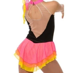 Is your little ice princess using “Spanish-themed” music in her first competition? We interpreted our classic halter neckline dress in a Spanish theme. Black velvet bodice with our new triple ruffle stretch illusion mesh skirt in brights!! Front sweetheart neckline and low back are supported with nude mesh. Absolutely darling!!