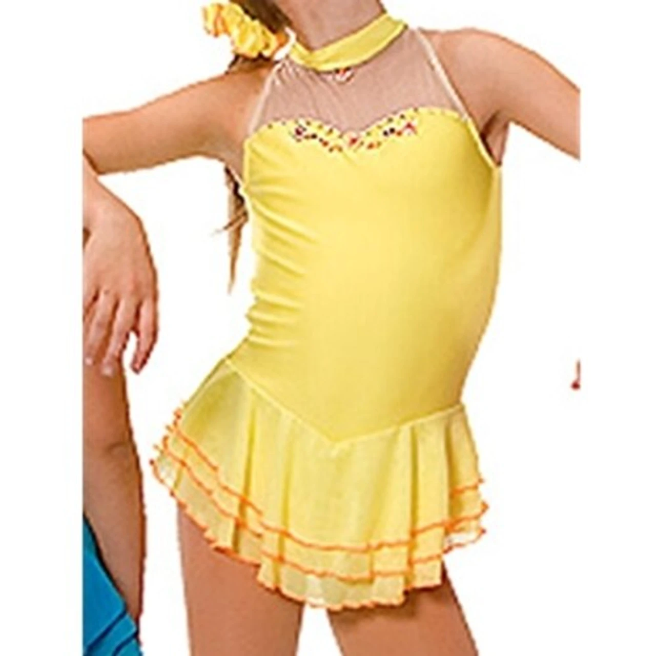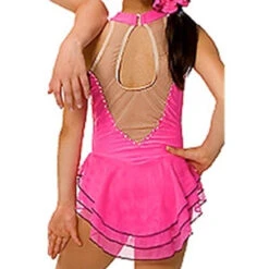 Just perfect for your skating princess.ย Front sweetheart and back necklines. Low back is supported with nude mesh. Triple layer stretch illusion mesh skirt edged in contrast thread. Absolutely darling!!