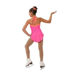 Darling tie-back halter dress in Italian matte tricotโfeminine without fussy. Soft classic skirt in matching color with contrast (or matching mesh underneath–both with lettuce-edge. Bodice piped in contrast, and ties at neck back with solid lycra tie. Nude mesh inset at front bodice for stability.