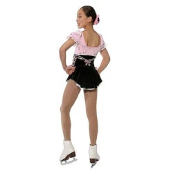 Fresh from Switzerland! Our “Alpine” dress will impress any judge with its traditional and classic lines. Choose either stretch velvet or Italian matter tricot with lace overlay and contrast. Scoop front and back neckline, puff elastic sleeves, and traditional skirt with lace underskirt. Bodice all tied together with laces.