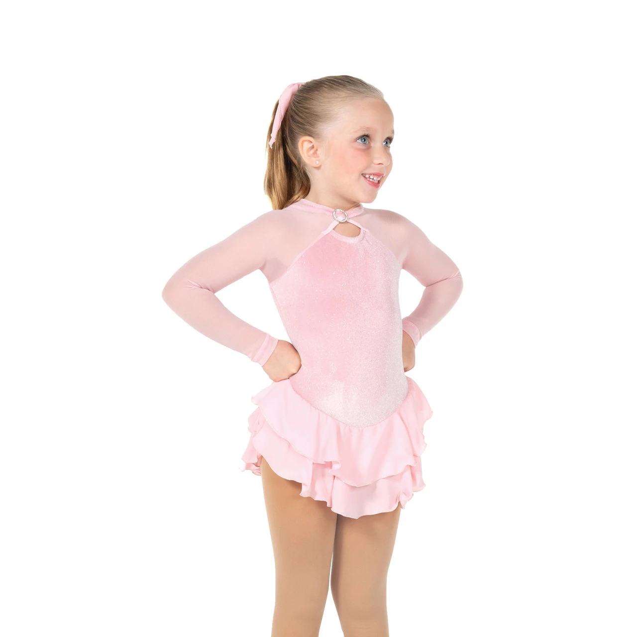 Soft shimmer velvet dresses with long mesh sleeves, double-layer georgette skirts edged in silver, and tiny front keyholes with a ring of accent crystals for a necklace-style look. Traditional style back keyhole.