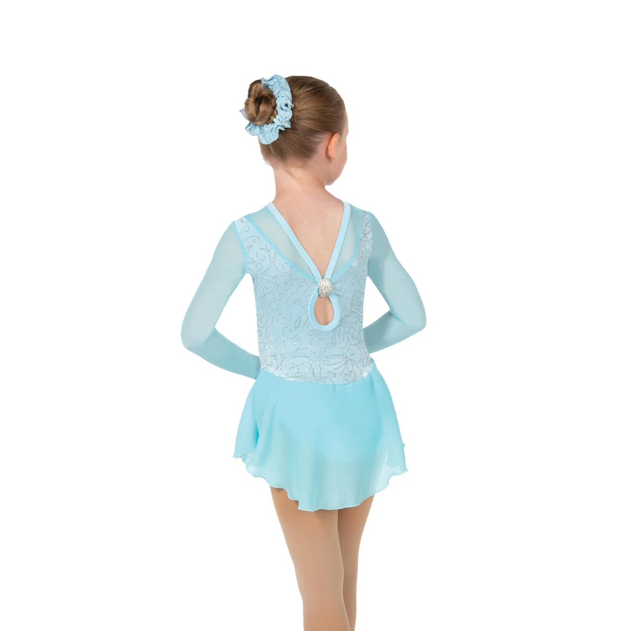Mesh accents along the neckline and in the long sleeves pair perfectly with the crystal blue glitter velvet and matching georgette skirt. A cluster of crystals accent the dropped back keyhole. Lined.