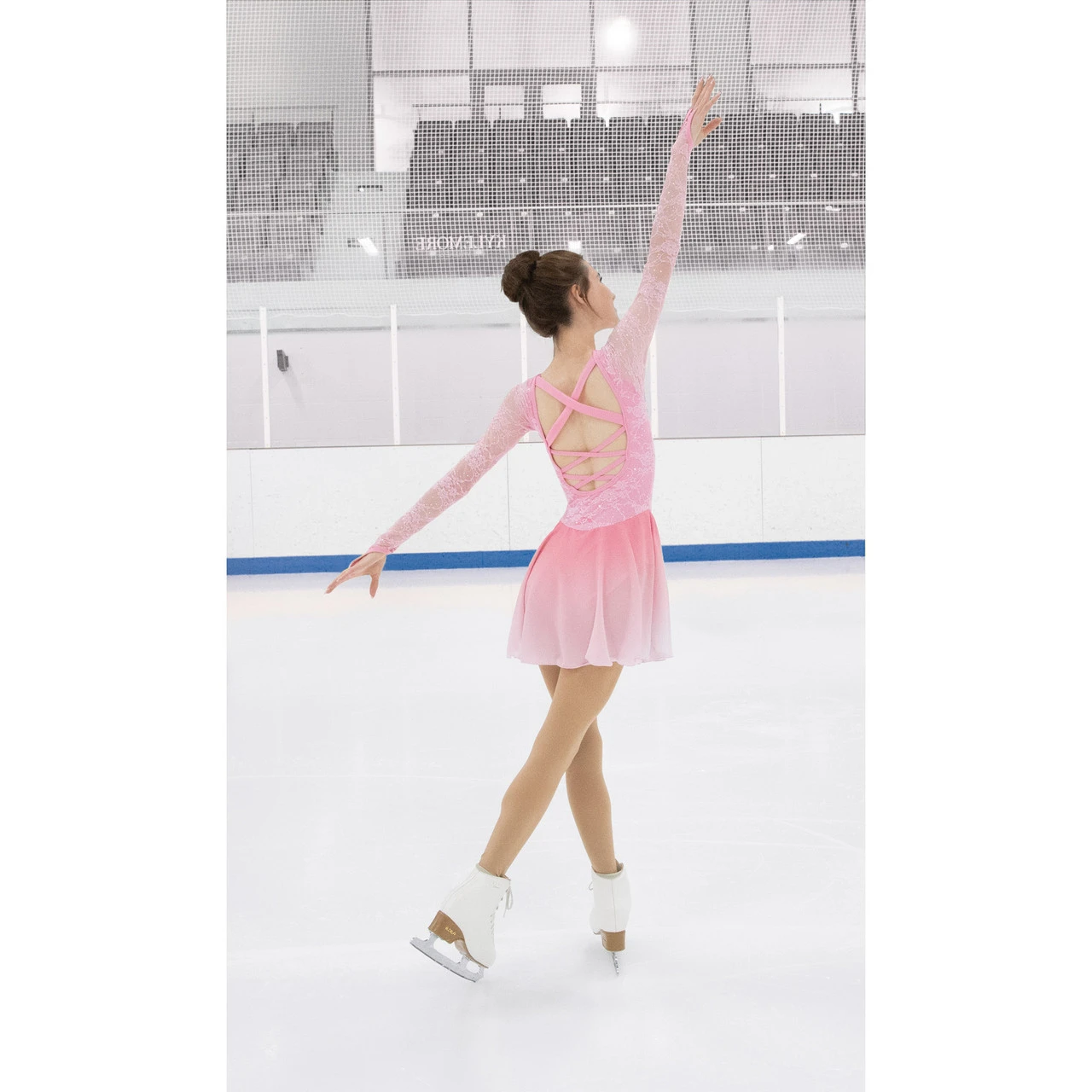 A charming confection of rosy glitter lace, long sleeves with finger points, a low back trimmed with crossed straps and a soft, flowy georgette skirt that fades to faint blush at the hem. Lined.