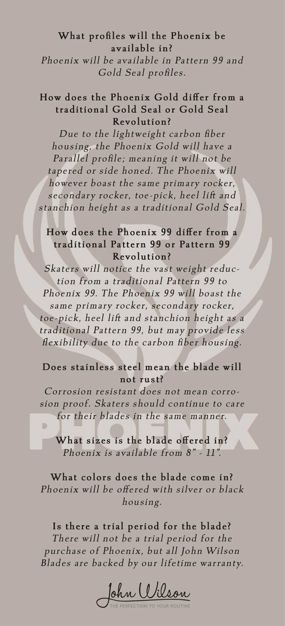 This feature allows the Phoenix to be the lightest blade on the market without any loss in strength, giving you savings in energy and more time in the air. This is officially the lightest blade ever made and showcases a full carbon fiber body with a stainless-steel runner. The stainless steel weโve selected will outperform anything we have offered before in its ability to resist corrosion while providing extended edge life. Perfectly designed to provide improved performance, this innovative blade design will allow athletes around the world to reach unprecedented technical heights. The skater with the competitive advantage is the one with the best technology.